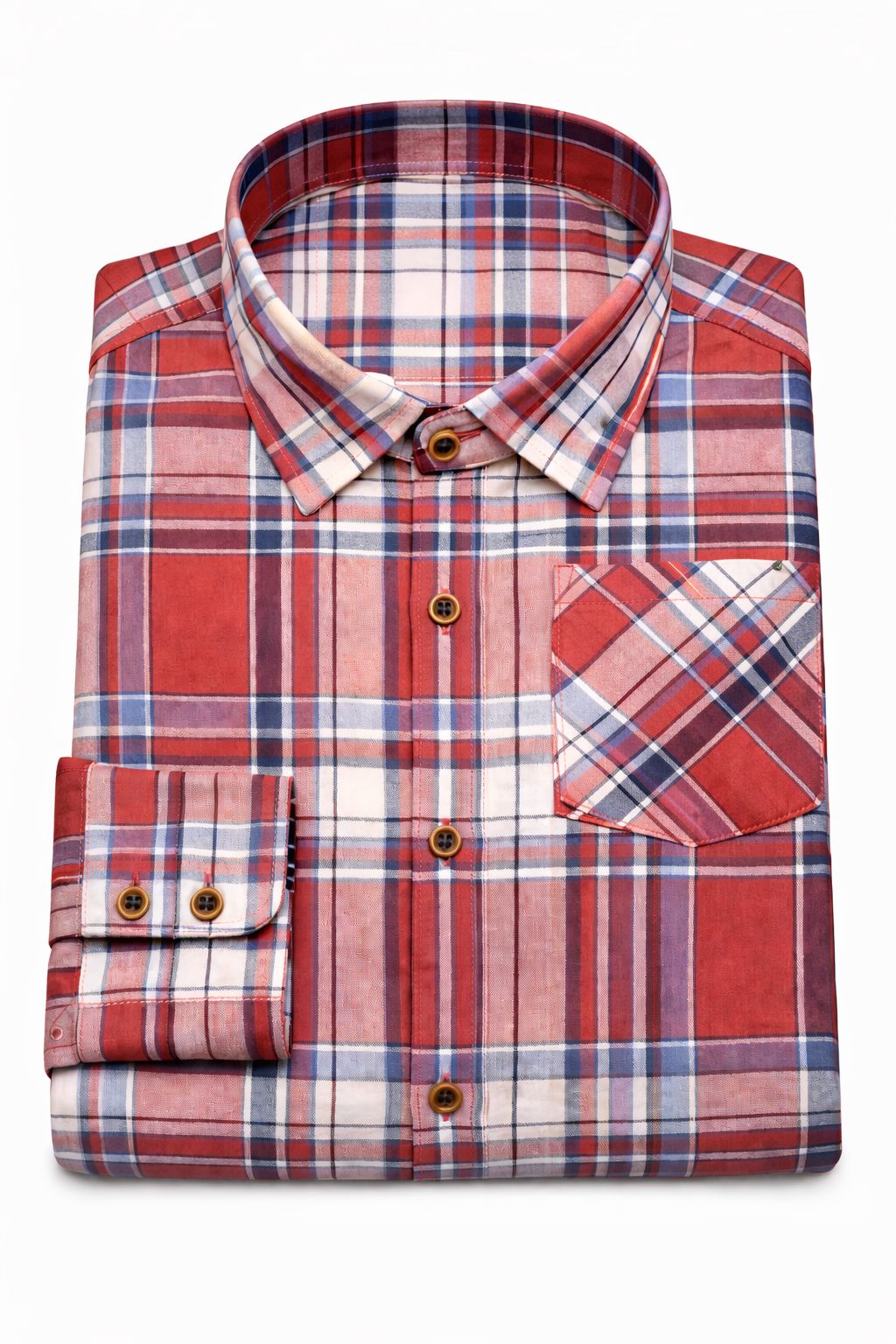 Crafted from premium cotton fabric, this shirt ensures breathability and all-day comfort. The vibrant check pattern in red, blue, and white tones creates a timeless casual appeal, making it ideal for weekend outings, informal office settings, and festive gatherings.