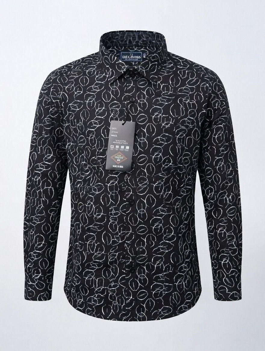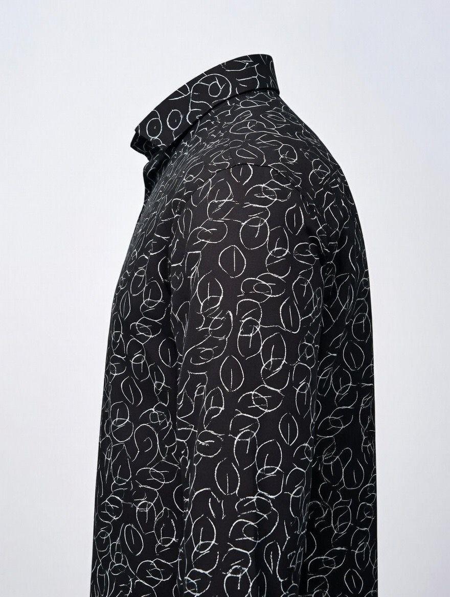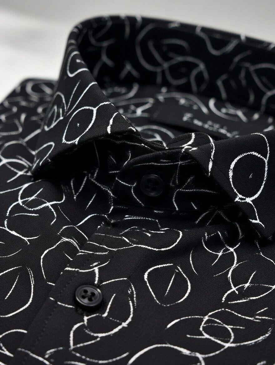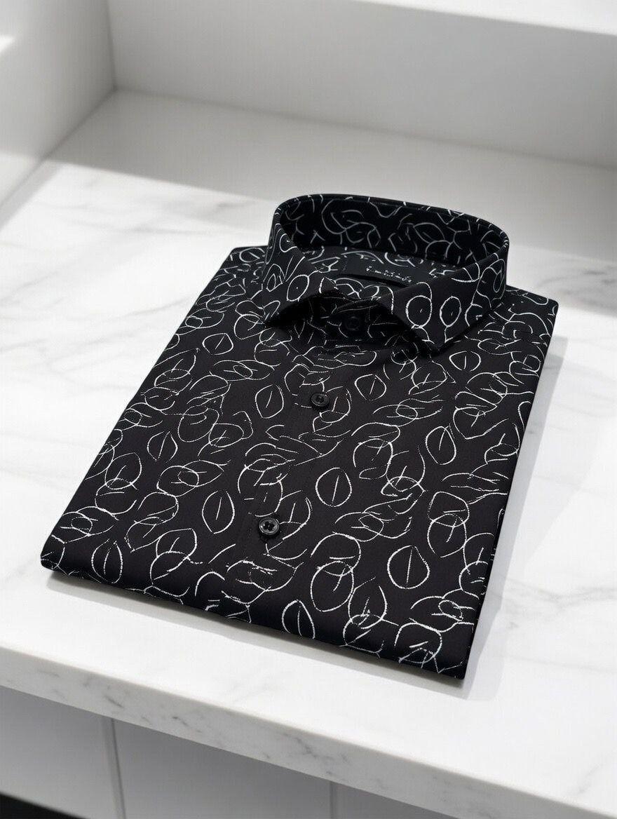 Make a striking style statement with this men’s black abstract print shirt crafted for a confident and modern appearance. The deep black base is enhanced with intricate white abstract line detailing, creating a high-contrast design that adds personality and edge to your outfit.