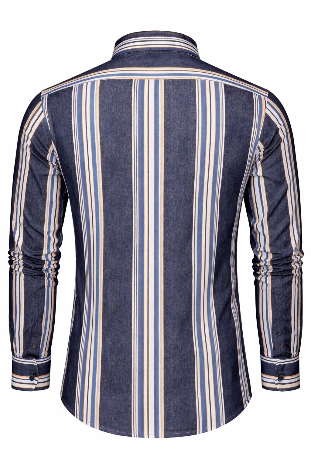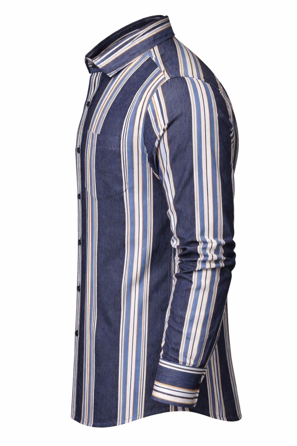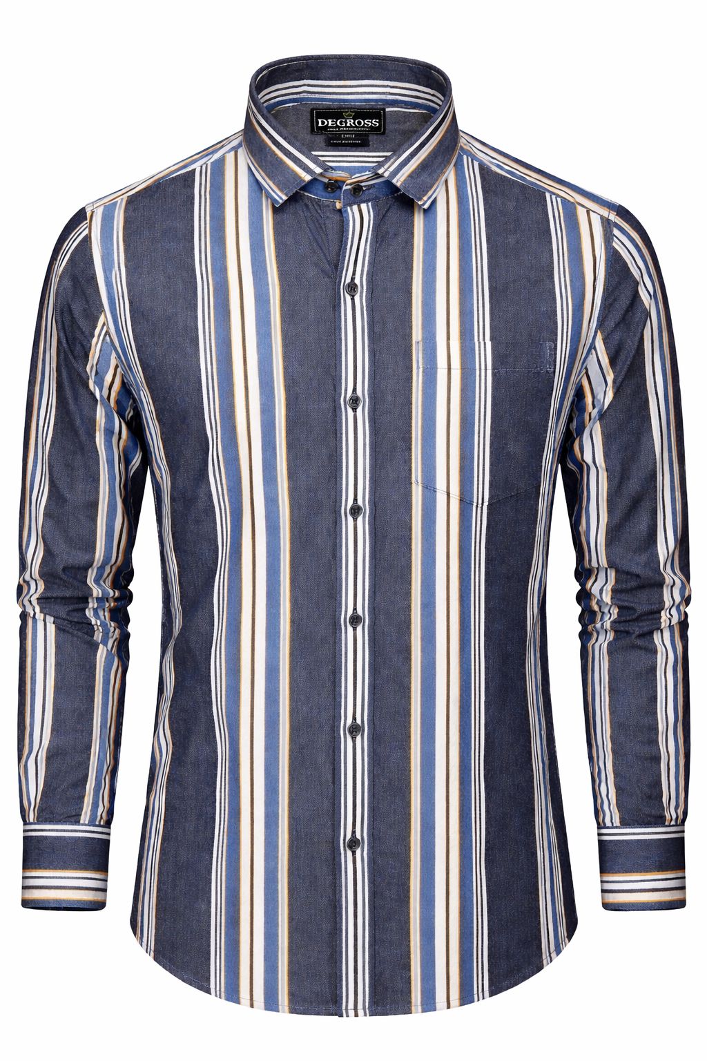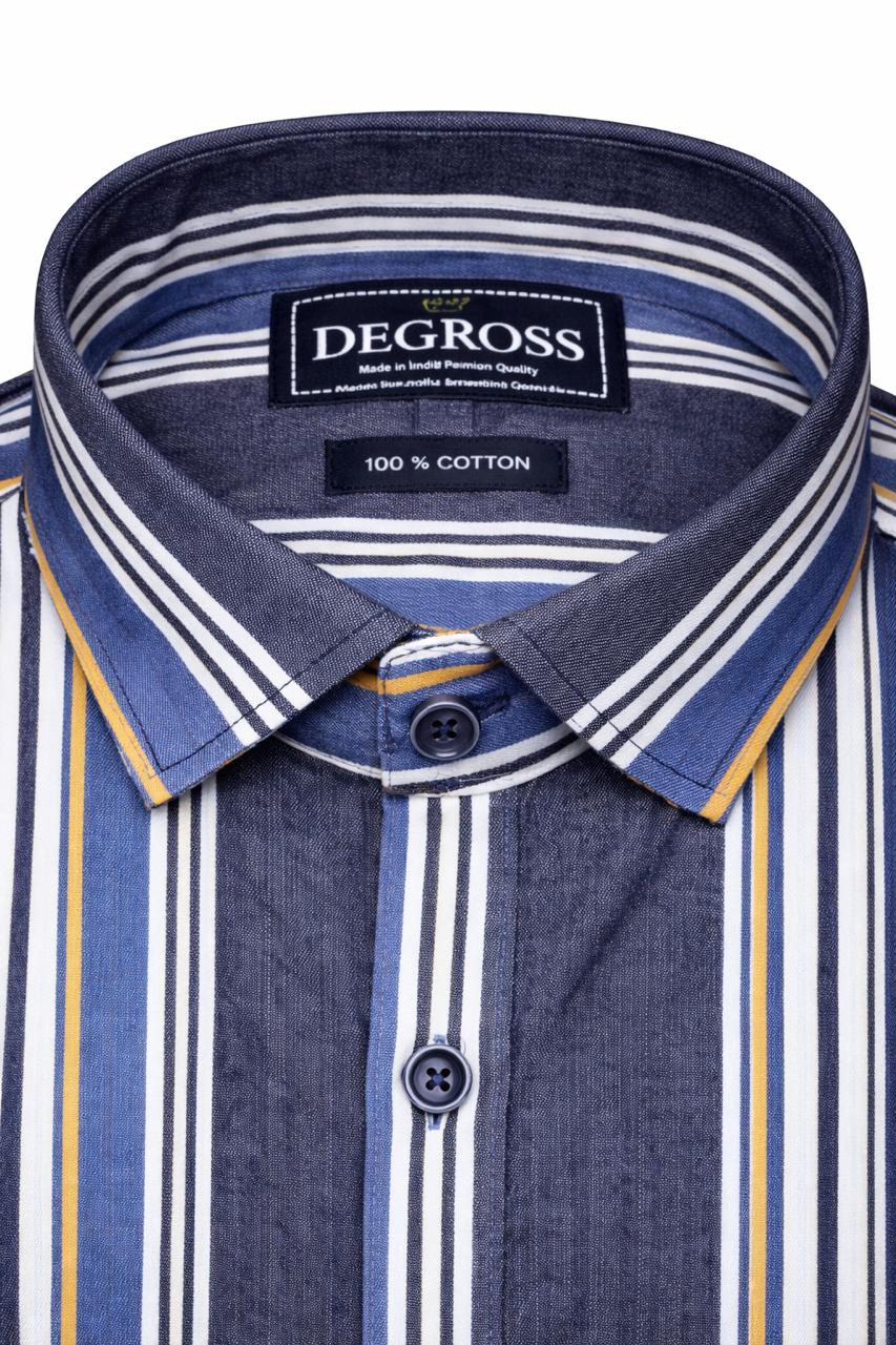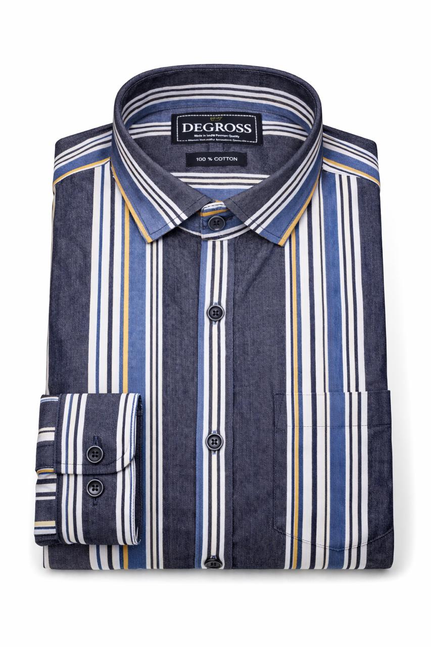 Refresh your wardrobe with this men’s blue vertical stripe shirt crafted for a refined and contemporary appearance. The deep blue base is enhanced with bold vertical stripes in white, light blue, and subtle mustard tones, creating a striking yet balanced design. The vertical pattern adds a streamlined effect, giving the shirt a sharp and confident appeal.