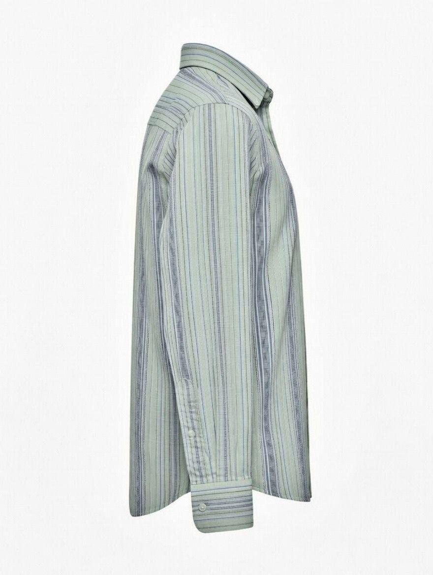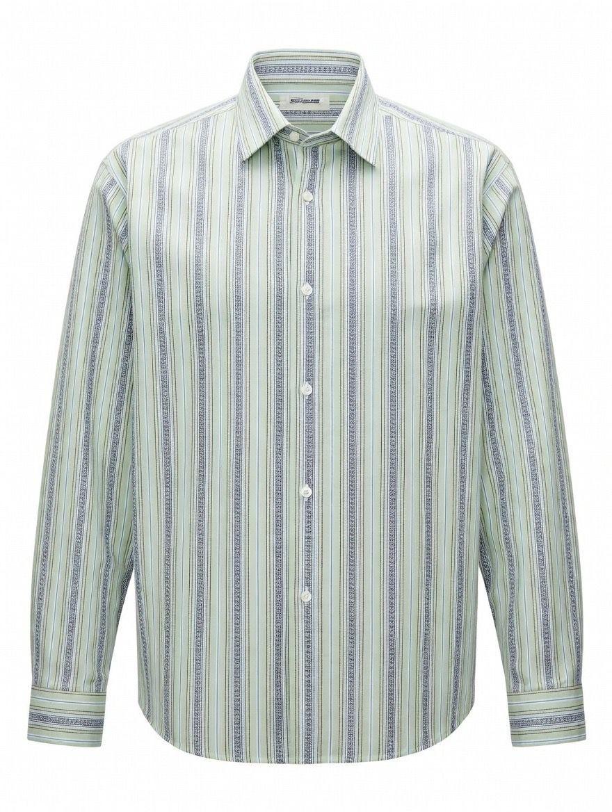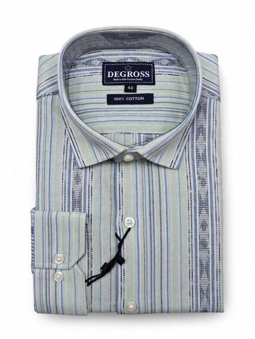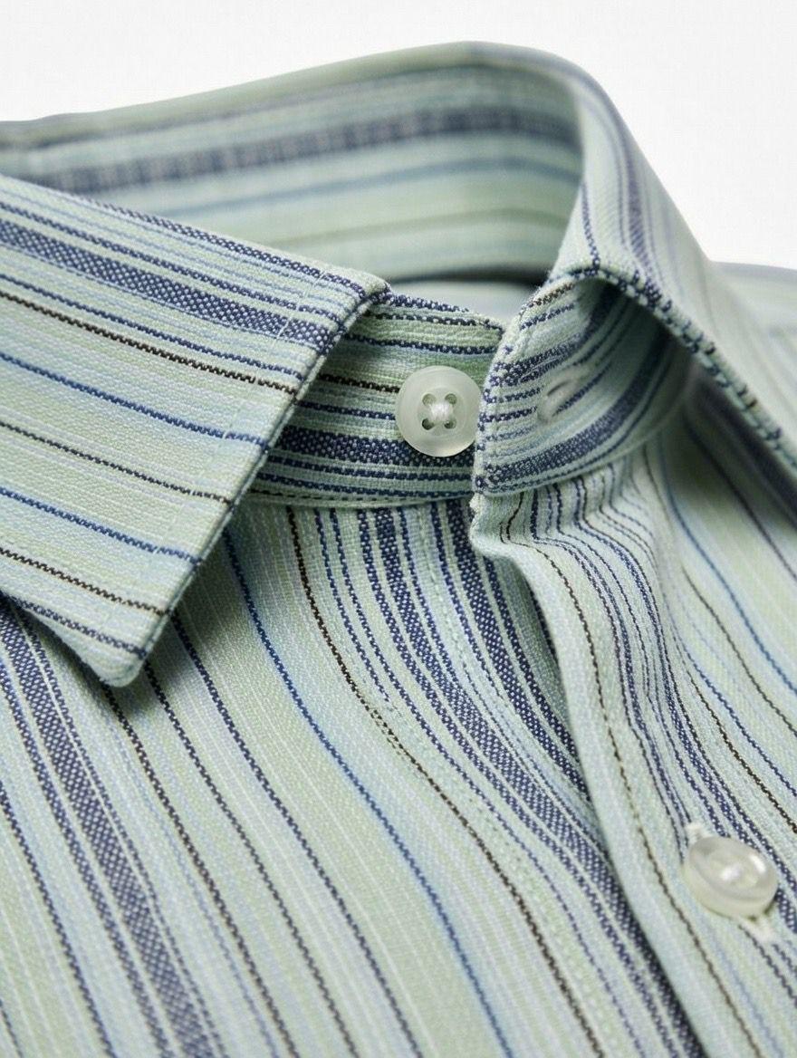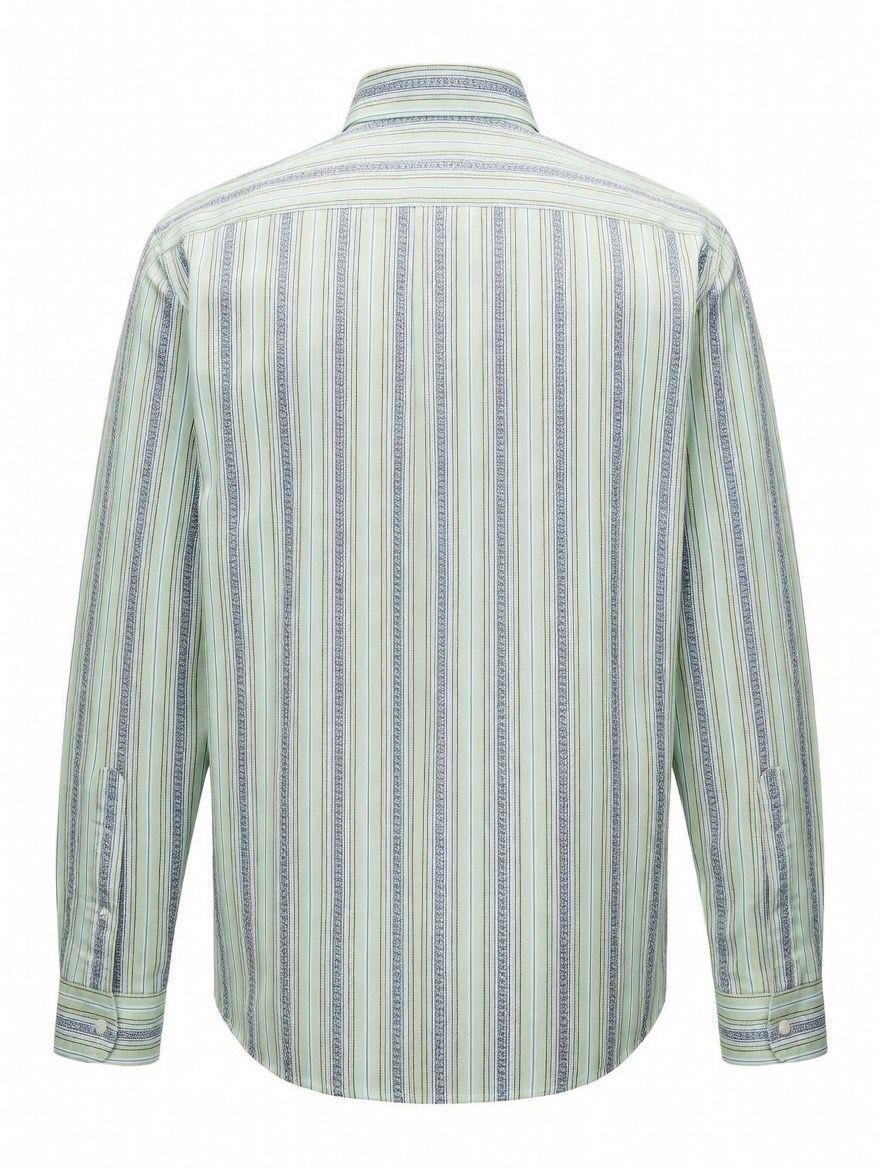 Enhance your wardrobe with this men’s light green vertical stripe shirt designed for a smart and polished appearance. The soft light green base is complemented by fine multi-tone vertical stripe detailing, adding depth and sophistication to the overall design. The vertical pattern creates a sharp and streamlined look, making it ideal for both office and casual wear.
